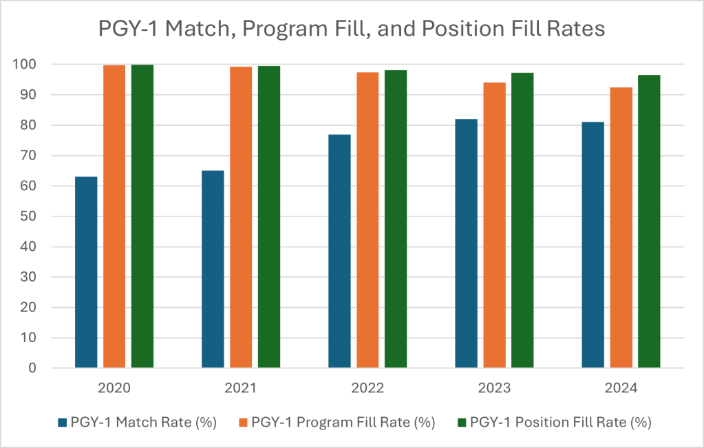 Figure 2. PGY-1 percent match rates, program fill rates, and position fill rates from 2020 through 2024.1