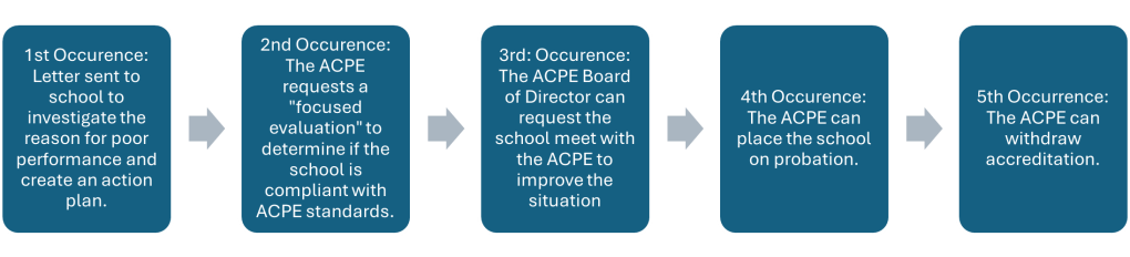 A major criterion for determining school quality is NAPLEX pass rates. In this post, I discussed the decline of NAPLEX pass rates and its potential causes. Since then, I discovered what happens to schools with abysmal pass rates. The Accreditation Council for Pharmacy Education (ACPE) accredits pharmacy schools. The ACPE takes notice when a school’s NAPLEX pass rate is two standard deviations below the national average.7 If a school’s percentage dips that low for the first time, then the ACPE sends a letter to the school. The letter insists that the school take action to improve first-time pass rates. Starting in July 2025, the ACPE will implement their updated standards. The new standards will allow for three years of low pass rates without accreditation changes (see Figure 1).8 I agree with allowing time to adjust curriculum, but probation could occur sooner. Probation status does not affect current students. They still graduate from an accredited program. It would, however, make prospective students think twice before applying to said program. This is why potential students should check a school’s NAPLEX pass rates.